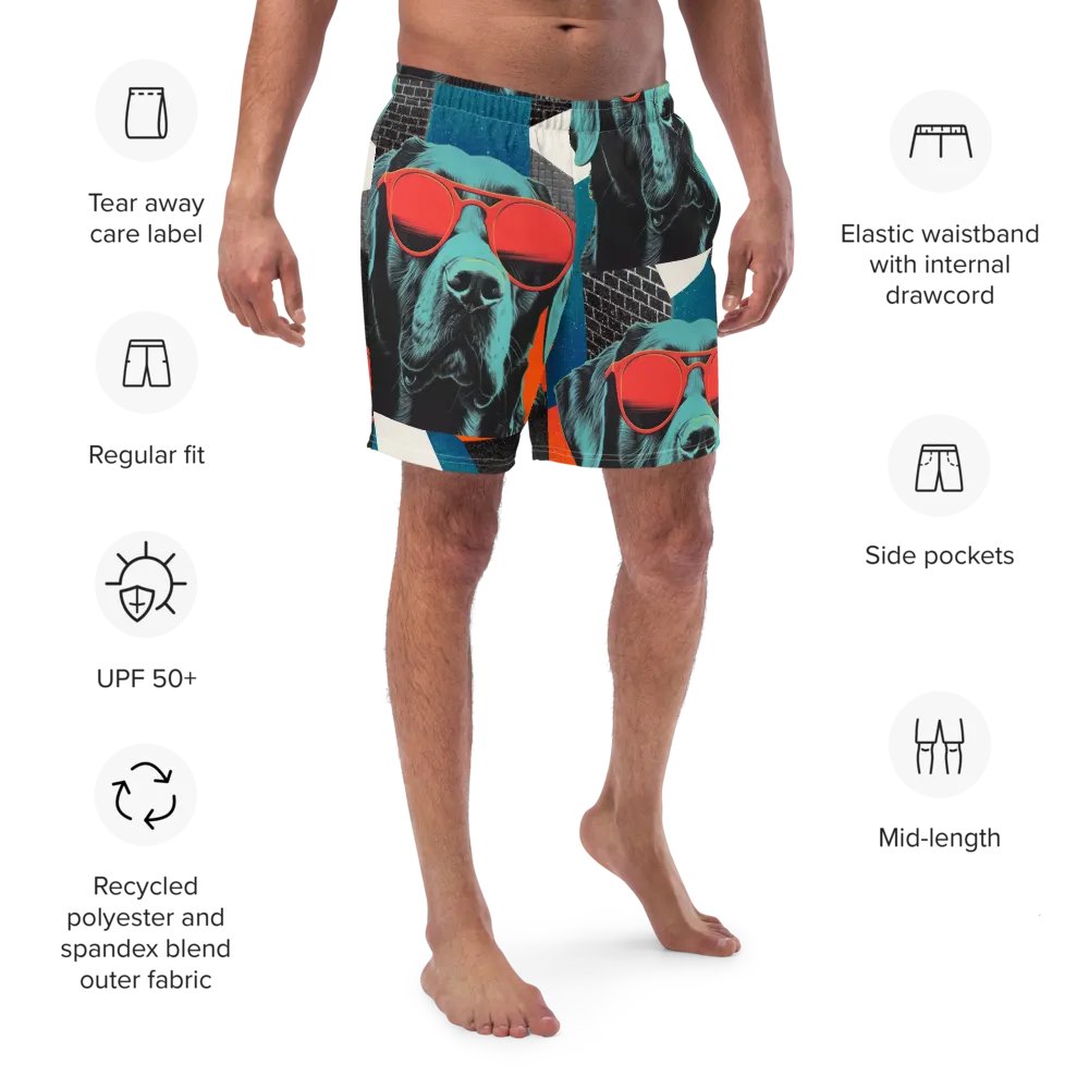 Men's swim trunks with all-over Labrador design, UPF 50+ fabric, quick-drying, and eco-conscious materials.