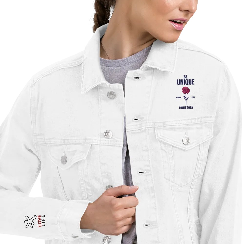 Unisex denim jacket with 'Be Unique, Write Your Own Story' embroidered graphic and red rose motif, made with 99% ring-spun combed cotton and 1% spandex. Adds a distinctive touch to any outfit. 'Live Life" and "Love Life" is embroidered on bottom of sleeves.
