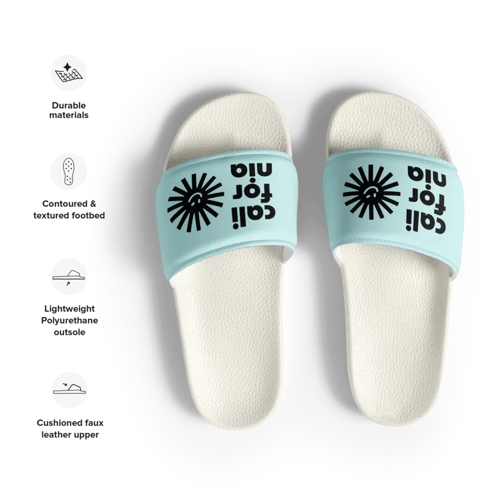 Step into sunny style and comfort with our cushioned, faux leather "California Fun'" Women's Slides in light cyan.